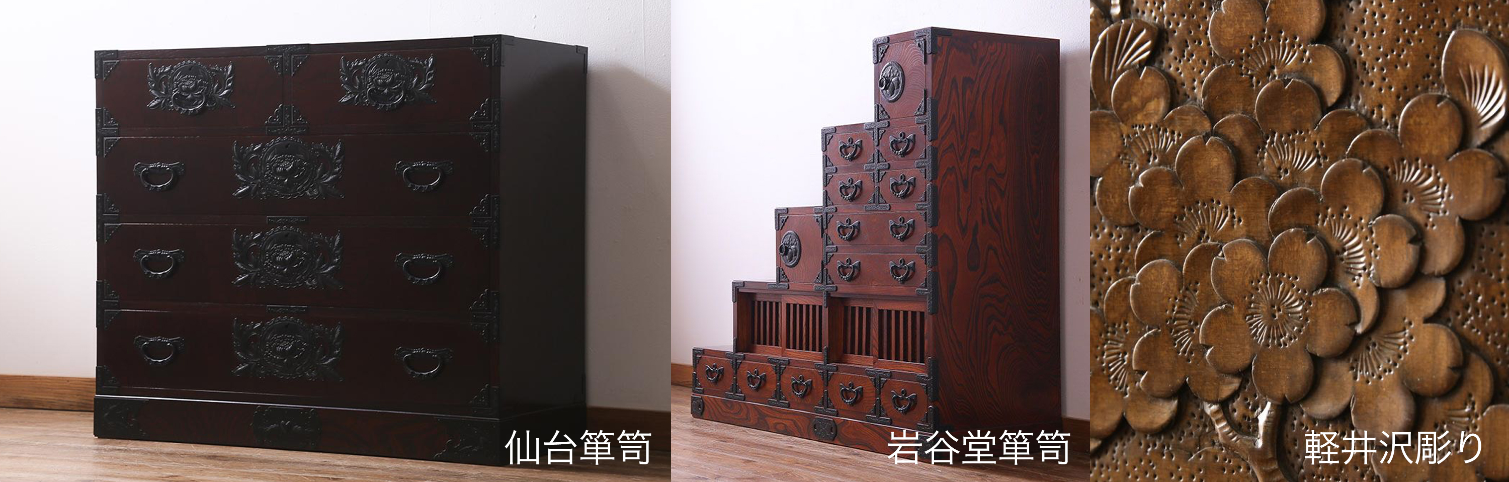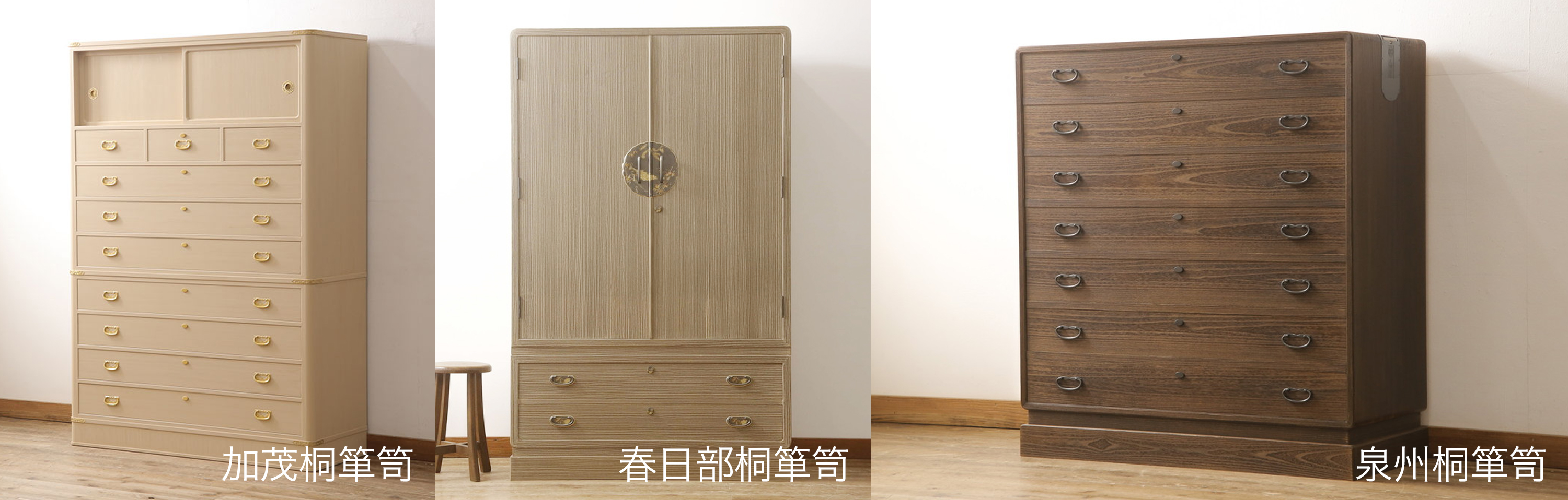 加茂桐箪笥、府中桐箪笥、春日部桐箪笥、名古屋桐箪笥、藤枝桐箪笥、泉州桐箪笥、紀州桐箪笥などが有名で、人気の高い老舗家具メーカー松本民芸家具の箪笥、力強い存在感を放つ仙台箪笥、耐久性も美しさも最高級の岩谷堂箪笥、軽井沢彫りの華やかな箪笥などもあり、それぞれ特徴も魅力も異なりますが、どれも職人さんの高い技術や熱心なこだわりが伝わってきて心惹かれるものがあります。