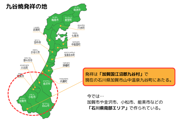 そしておよそ100年の時を経た1800年ごろ、再び九谷焼を復活させる機運が高まります。京都などから技術指導を受け、九谷焼の製造が再開されたのでした。以降、現在に至るまで九谷焼の技術と伝統が受け継がれています。