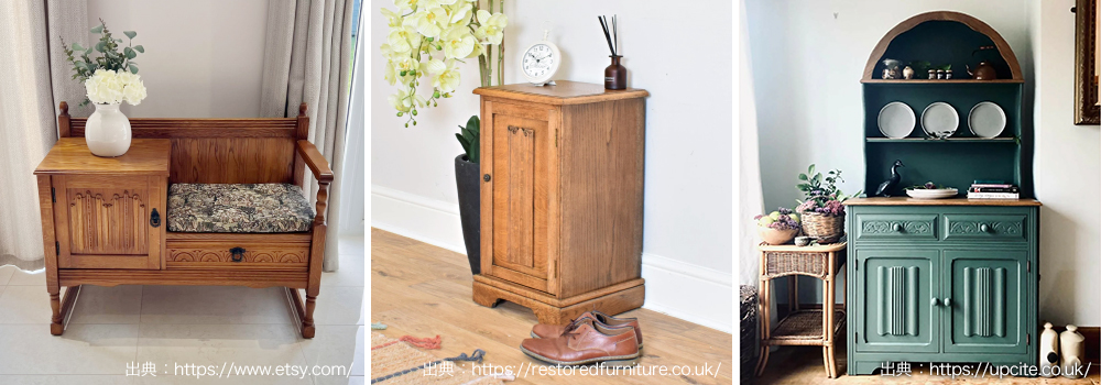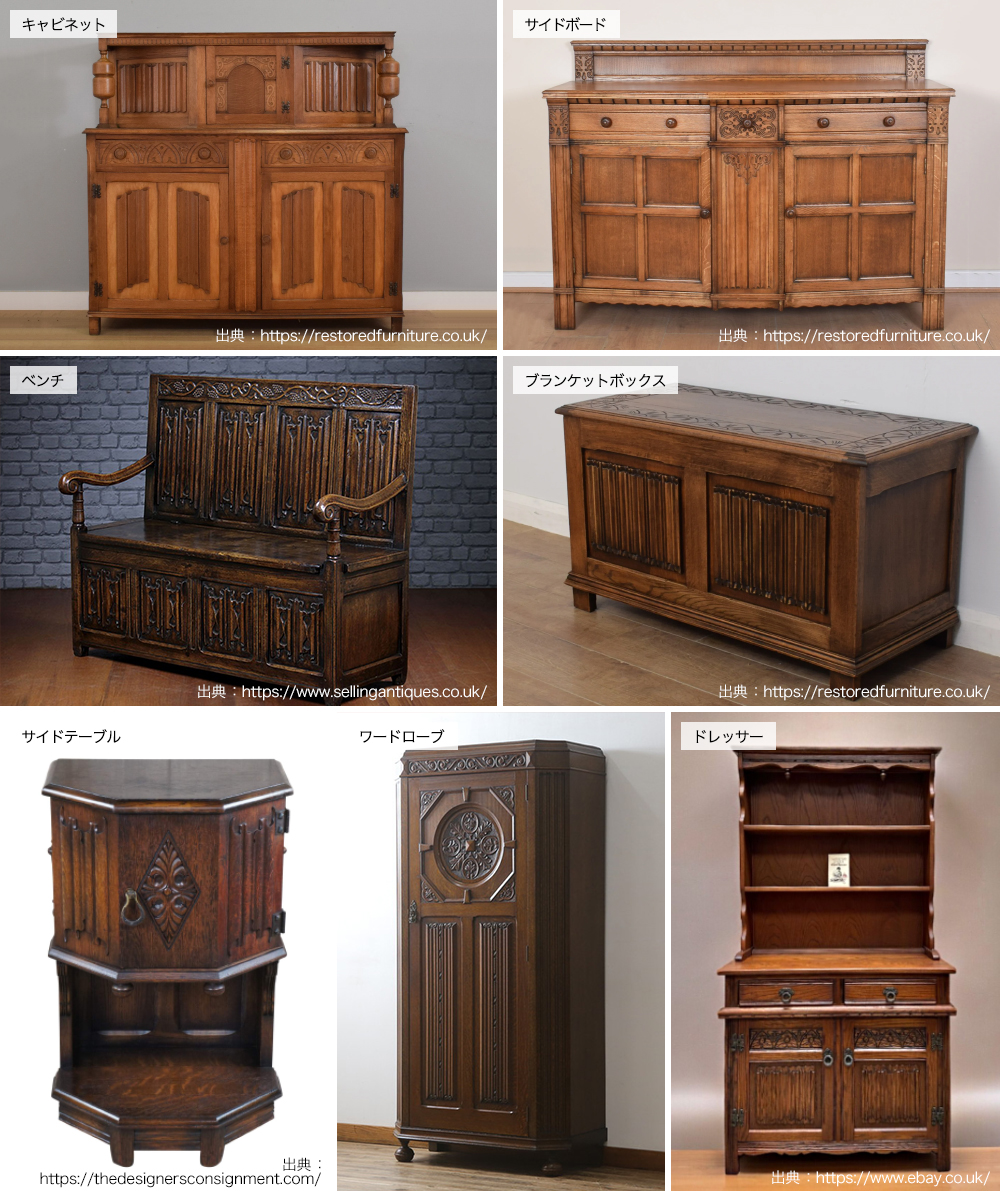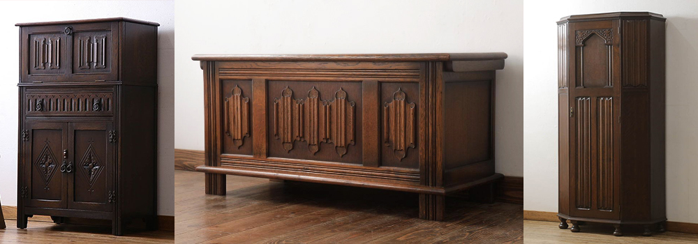 リネンフォールドの装飾は、チェストやサイドボードなど木製扉(木製の平面)の面積が広い家具に施されることが多いです。実際にリネンフォールドをあしらった家具をいくつかご紹介していきます。