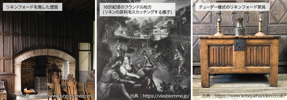 リネンフォールドは14世紀頃のフランドル地方で誕生したといわれています。この頃の建築物はゴシック様式で建てられ、その壁面パネルの装飾的要素としてリネンフォールドが採用されました。なぜリネンがモチーフだったのか、それは当時のフランドル地方がリネン産業で栄えていたことが大きな理由でした。そうして生まれたリネンフォールドは華やかな見た目をしているものの、比較的シンプルな加工法でできているので取り入れやすく多くの好評を得ました。14〜16世紀にかけて北欧全域へと普及していきますが、家具においては特にイギリスのチューダー様式で人気を博します。