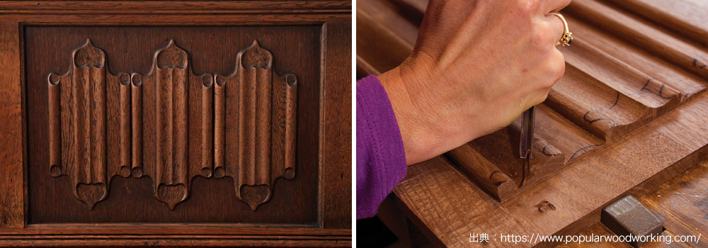 波打つ優雅な折り目、そして今にも動き出しそうな立体感のあるリネンの様子が浅浮き彫り(レリーフ)で見事に表現されている所が最大の特徴です。その姿はまるでふんわりと風を含んだカーテンのようにも見え、エレガントで高級感のある雰囲気を漂わせています。素材によく使用されているのは高級木材であるオーク材。重くて硬い丈夫な材質と美しい木目を併せ持ったオーク材は、重厚感を醸し出しながら優美なデザインを引き立てています。