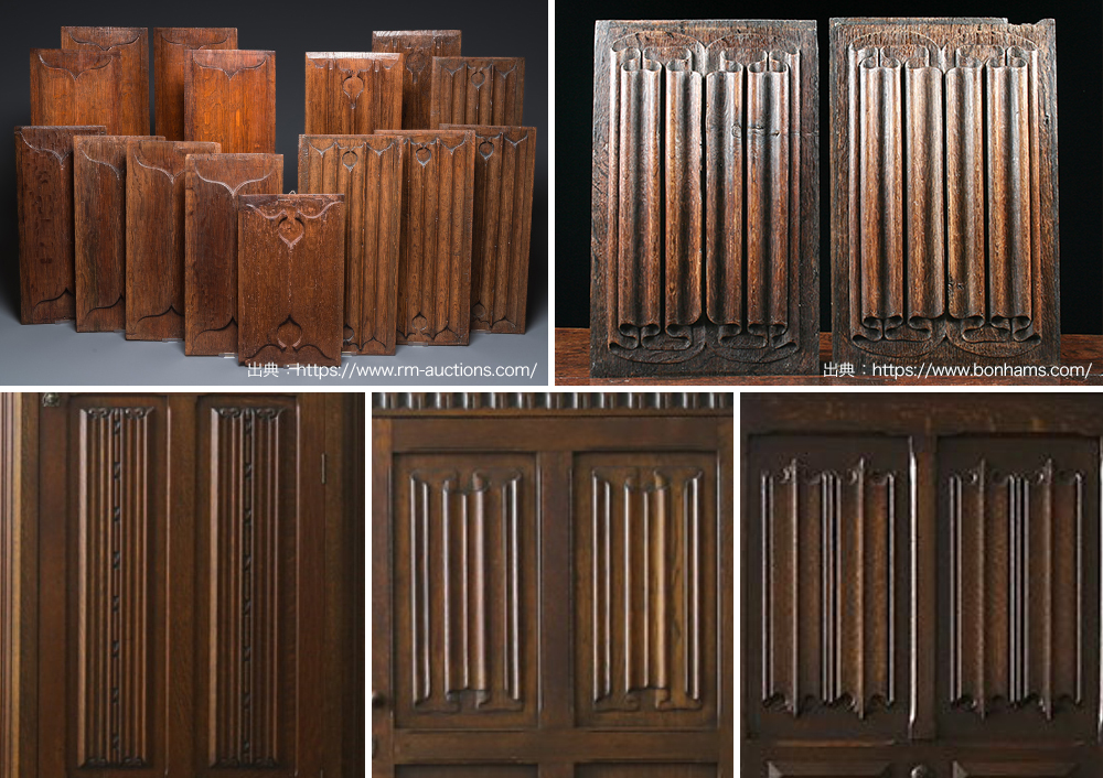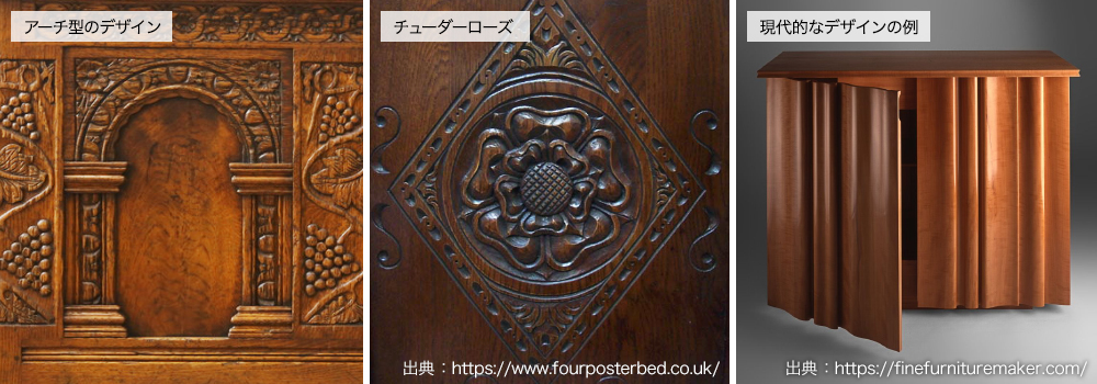 リネンフォールドは、同じ浅浮き彫り(レリーフ)で施される装飾「アーチ」「チューダーローズ」と共に、チューダー様式を代表する装飾としてたくさんの家具を美しく彩りました。フランス・ドイツ・オランダなど各地域でも独自の発展を遂げていきます。