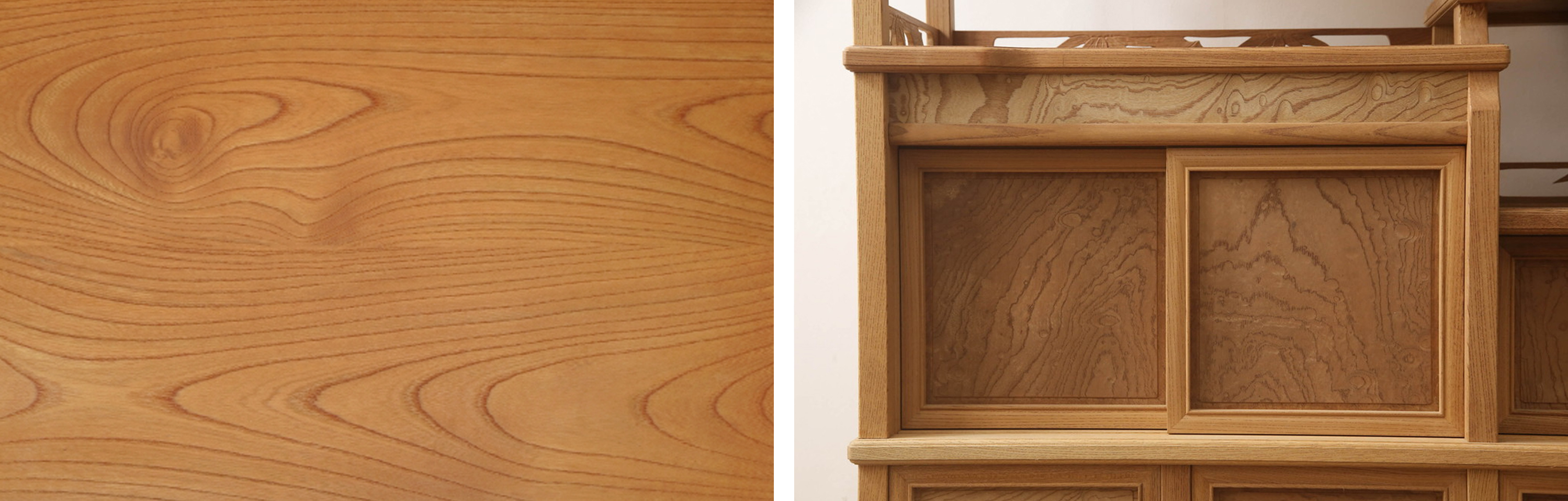明瞭で艶のある美しい木目を持ち、さらに「玉杢」「如鱗杢」といった様々な珍しい杢目によって鑑賞性を一層高めるケヤキは大変人気が高く、広葉樹の代表格といえる存在です。