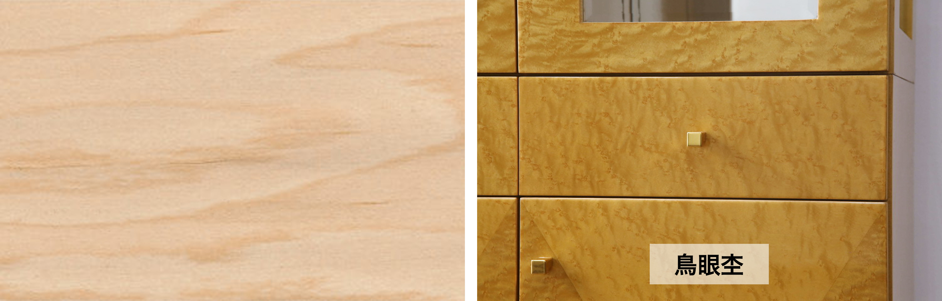 明るく清潔感のある乳白色・緻密な木目・時折現れる鳥眼杢(ちょうがんもく)という希少な杢目・滑らかな質感などいくつもの美点を持ち合わせたメープル材は、白色系の無垢材の中でも特に人気の高い木材です。