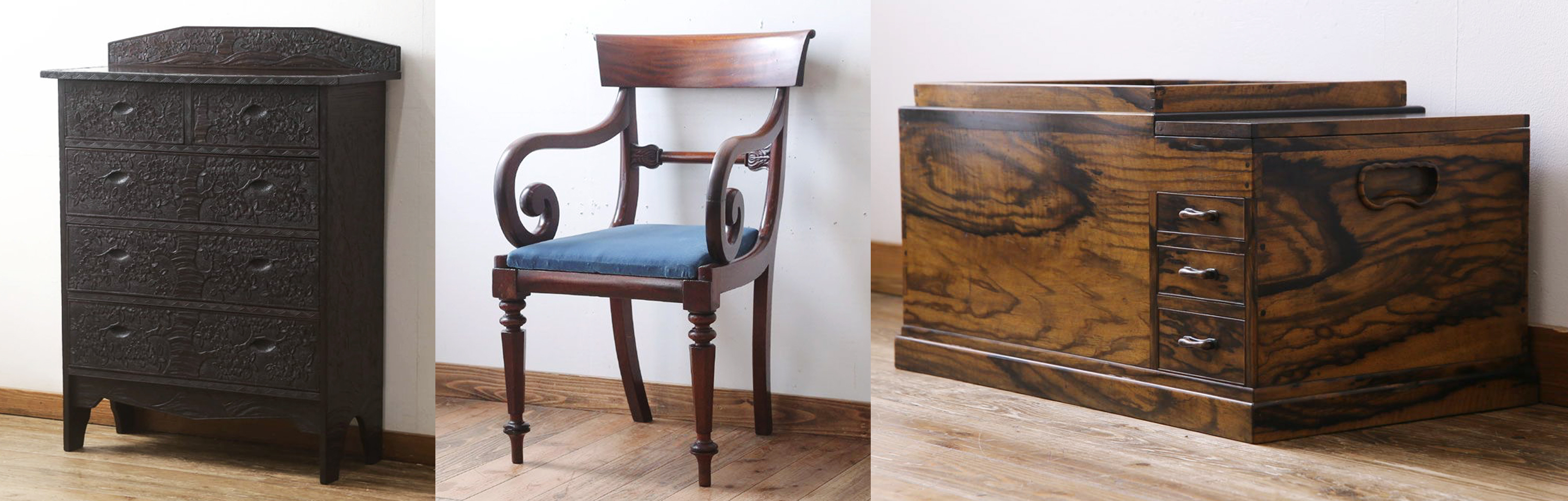 アンティーク家具も、現代の家具同様に無垢材もしくは突板などを用いて家具がつくられています。
