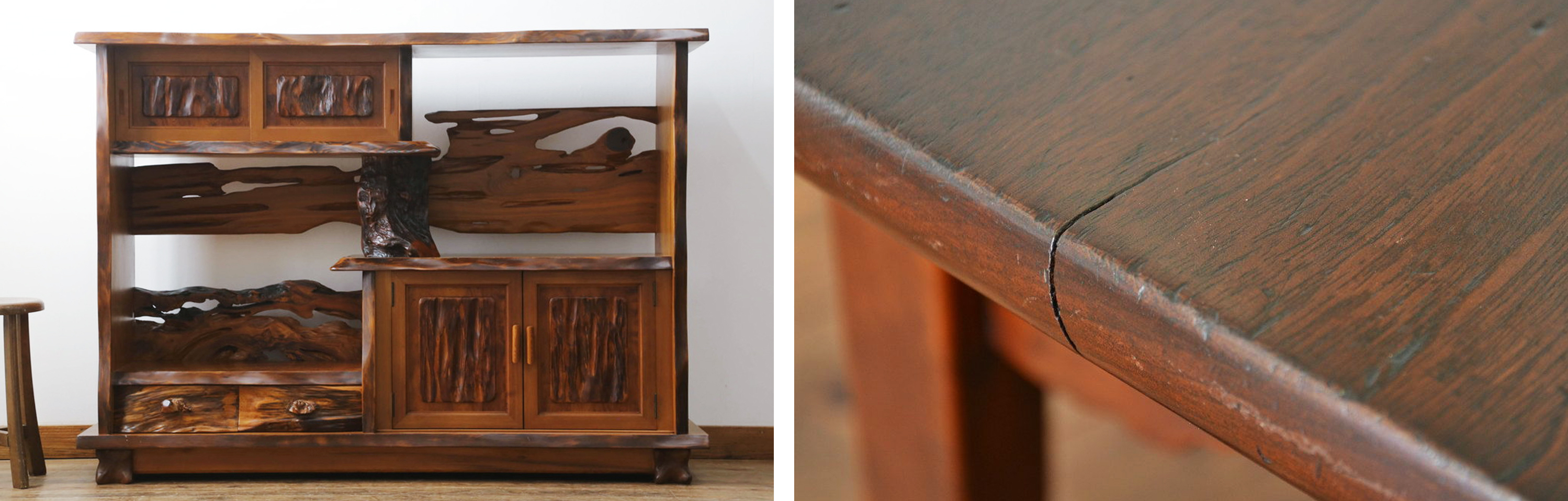 無垢材、つまり木そのものが素材であるため色や木目など全てがオンリーワンなのですが、さらに当時の家具づくりは手作業が多く一点物のデザインも数多く存在します。