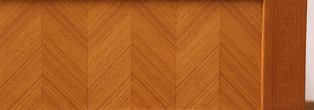 上記の写真はクォータリングと呼ばれるもので、厳密にはヘリンボーンと異なりますが、4つに分けた板を木目に逆らうように寄せることでヘリンボーンに似た模様を作ることができ、家具の装飾によく用いられています。