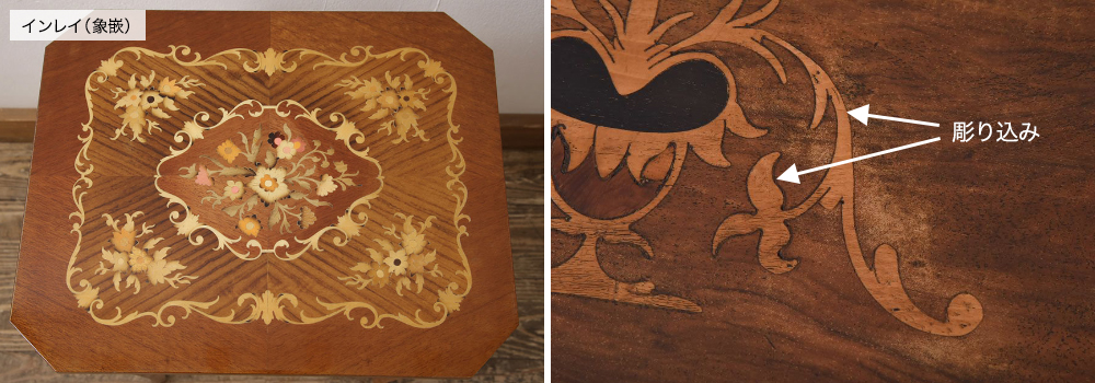 色味の異なる薄板を、模様に合わせて切り抜いたり重ねたり張り合わせりしてコントラスを出しながら絵を描き、それを1枚のシートにはめ込んで家具の表面に張り付けるという技法で作られます。