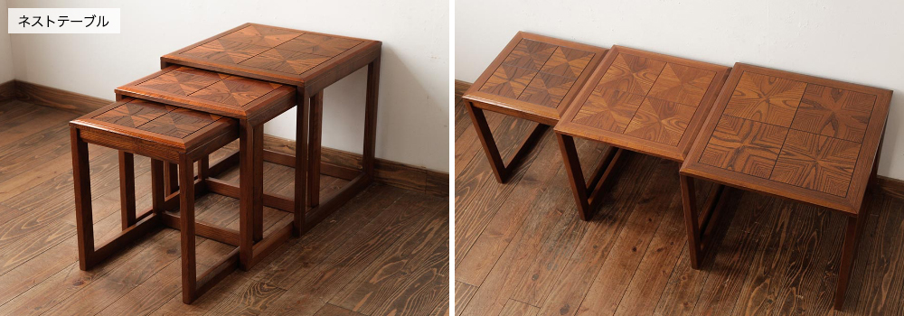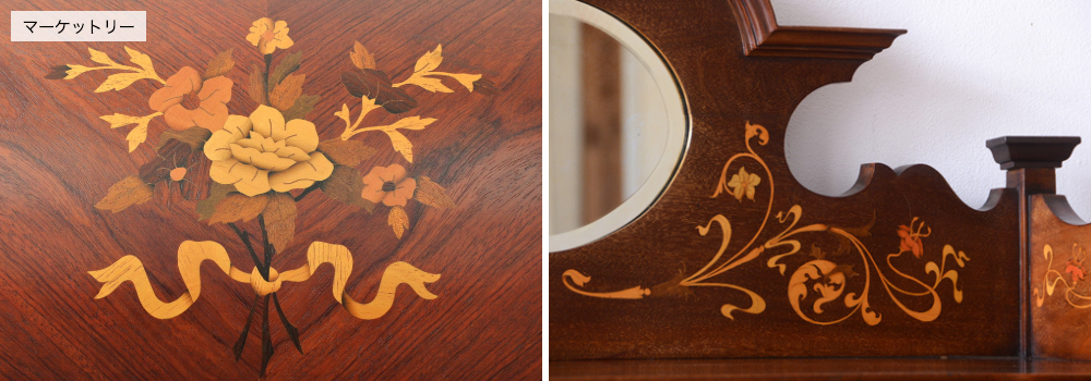 マーケットリーと見た目が類似した「インレイ」もしくは「象嵌(ぞうがん)」と呼ばれる技法があります。こちらは家具本体に模様の型を彫り込み、そこに別の木材を埋め込んで模様を描きます。見た目がマーケットリーとよく似ているため見分けがつかない場合も多くあります。