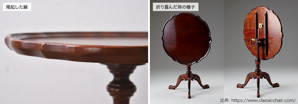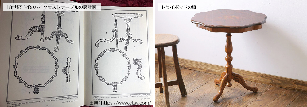 中でもクイーン・アン様式やチッペンデール様式で作られたパイクラストテーブルが有名で、特にトライポッド(3本脚が支柱を支えるようなスタイル)の脚を持つ天板のほとんどがパイクラストのデザインで作られました。
