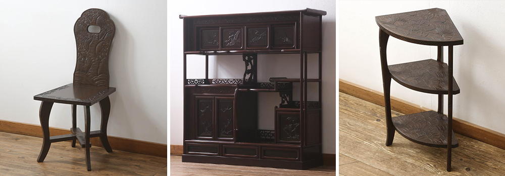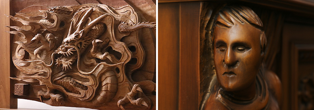 日本でも6世紀頃の飛鳥時代から仏像や建築物などに用いられてきた浮き彫り。アンティーク和家具の装飾としてもよく見かけます。浮き彫りで描かれるのは縁起を担いだ「鶴・亀・桜・松竹梅」や、運気をもたらすとされる「龍・鯉・虎」など、伝統的なモチーフがよく使われました。中でも日本で有名な木彫細工といえば「軽井沢彫り」「日光彫り」などが挙げられます。