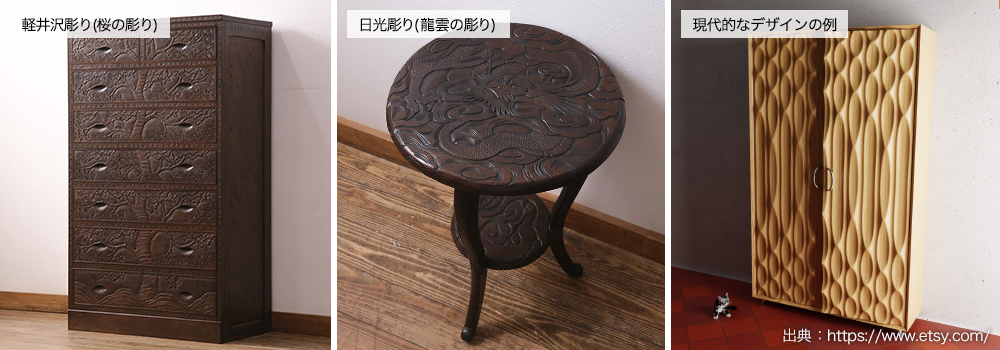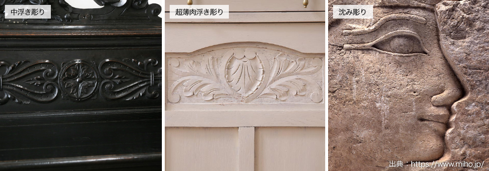 古くから世界中で愛され親しまれてきた浮き彫りは、現代でもなおアンティーク調の家具を作る際に用いられ、さらにモダンな新しいデザインも多様に生み出されています。