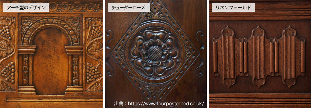 素材に対して浅く彫り込むことを浅浮き彫り、もしくはローレリーフといいます。素材によく用いられているのは、とても硬い材質を持つオーク材です。立体感はそれほどないものの平面的な装飾よりは存在感が出やすく、繊細なデザインによって洗練された雰囲気を醸し出します。浅浮き彫りで施される装飾で代表的なのが、ゴシック様式の「アーチ」、薔薇をモチーフとした「チューダーローズ」、リネンのしなやかさを表現した「リネンフォールド」などです。
