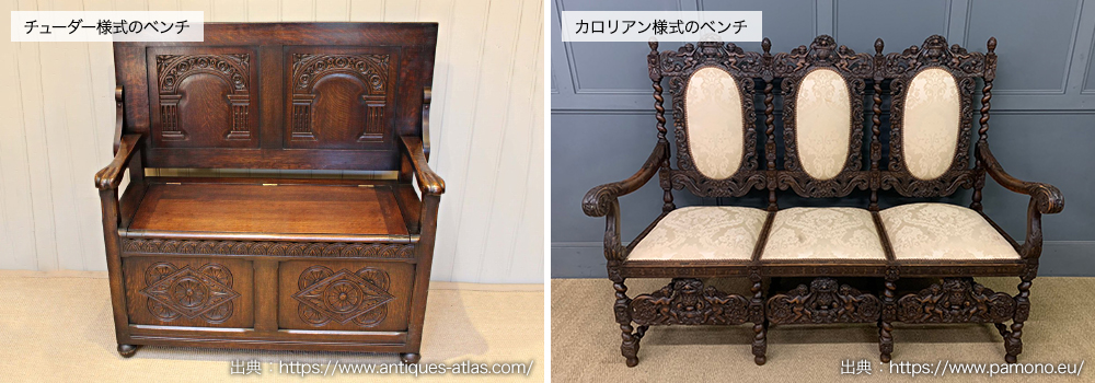 浮き彫りが家具の装飾として取り入れられたのは、15世紀にイギリスを統治していたヘンリー7世によるチューダー様式からだといわれています。この時代の家具作りにはよくオーク材が用いられ、その硬い材質を活かして施されたのが「浅浮き彫り」でした。後にチャールズ2世によるカロリアン様式になるとウォールナット材の輸入が始まり、ウォールナット材の加工のしやすさから「高浮き彫り」が主流となっていきます。芸術をこよなく愛するチャールズ2世によって、フランス・オランダ・スペイン・中国趣味(シノワズリ)などの影響を受けた家具がたくさん作られました。その後も伝統的な技術やデザインは受け継がれ、浅浮き彫りと高浮き彫りを組み合わせて遠近法を表現したり、様々な素材とスタイルを使用しながら幅広い分野で発展していきました。