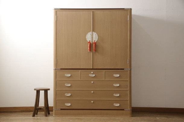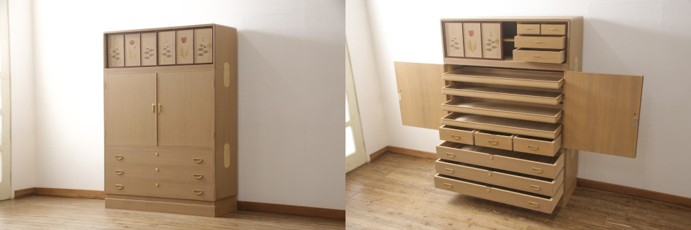 泉州桐箪笥で衣装箪笥と並んで多く作られているのが、着物箪笥です。衣装盆を観音開きの扉の中に備え、着物を美しい状態で収納できる優れものです。着物を多く持つ方には憧れの箪笥となっています。