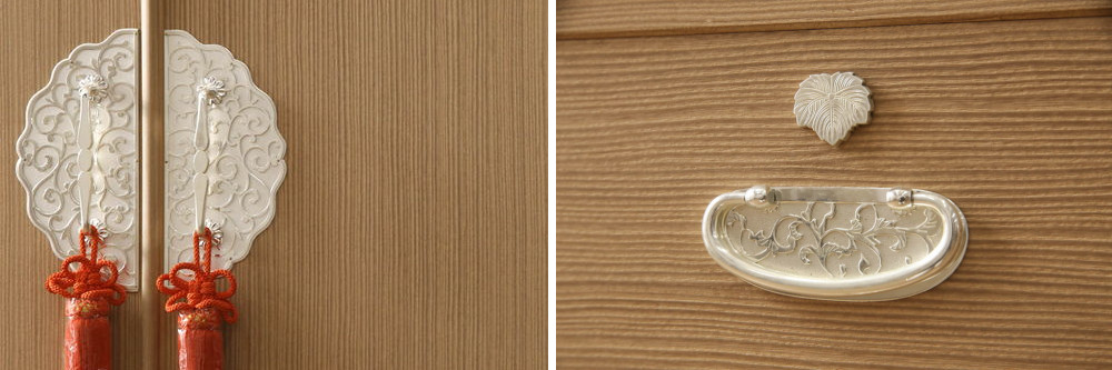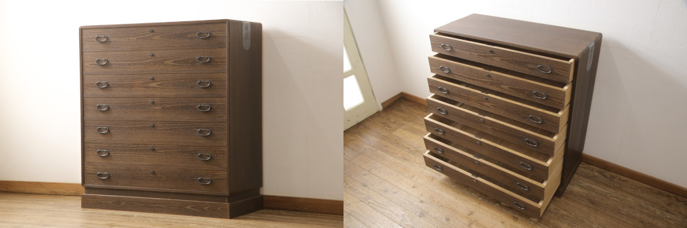桐の箪笥と言えば、気密性に優れ調湿効果もあるため衣装箪笥に最適です。泉州桐箪笥の引き出しは寸分の狂い無くぴったりと閉まる特徴があります。今ではあまりない風習になりましたが、美しいしつらえと繊細な衣装箪笥は嫁入り道具としても愛されていました。