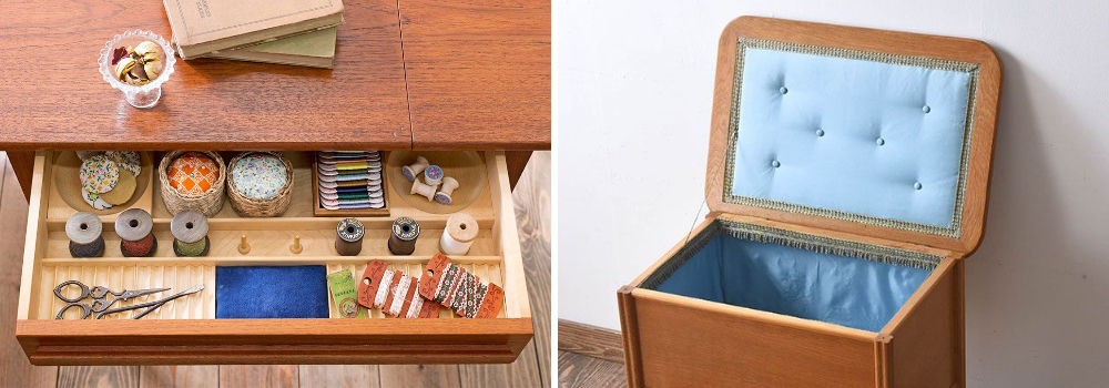 裁縫に必要なたくさんの備品をしまうため、天板の下には引き出し式、もしくは天板がフタのようになるボックス式の収納スペースが備え付けられています。