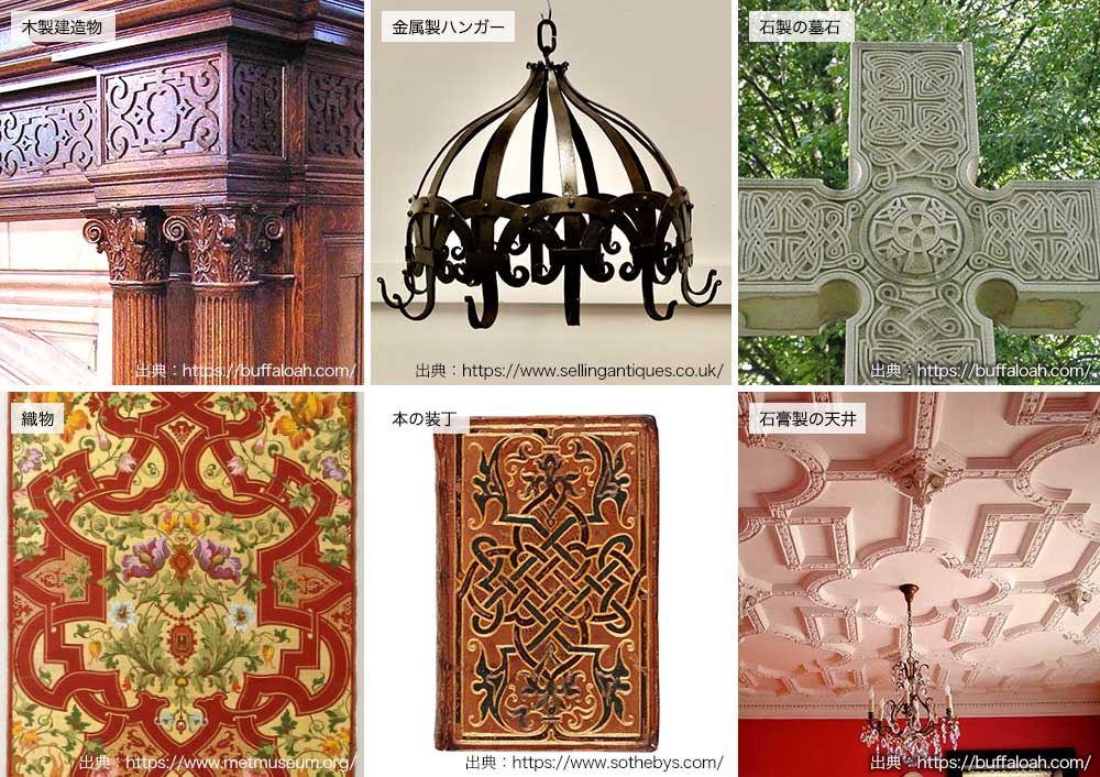 古くからある装飾で、歴史的建築物・家具・彫刻・織物・本の装丁・絵画などあらゆる物の装飾部分に使われてきました。