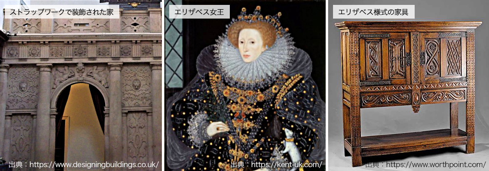 15〜16世紀頃にストラップワークがイギリスへ伝来すると、家の入口ドアのモールディングなどで用いられたり、エリザベス様式の家具でも好んで使用されるようになります。