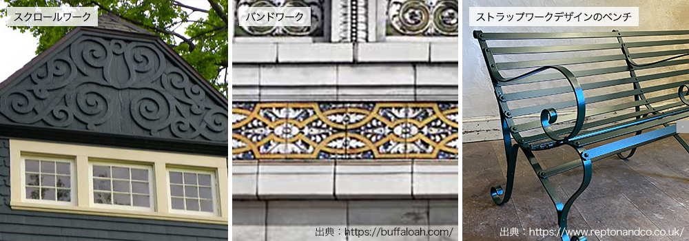 また庭用のベンチ等でよくある、背もたれや座面に平たい帯が並べられたようなデザインも「ストラップワーク」と呼ぶことがあります。