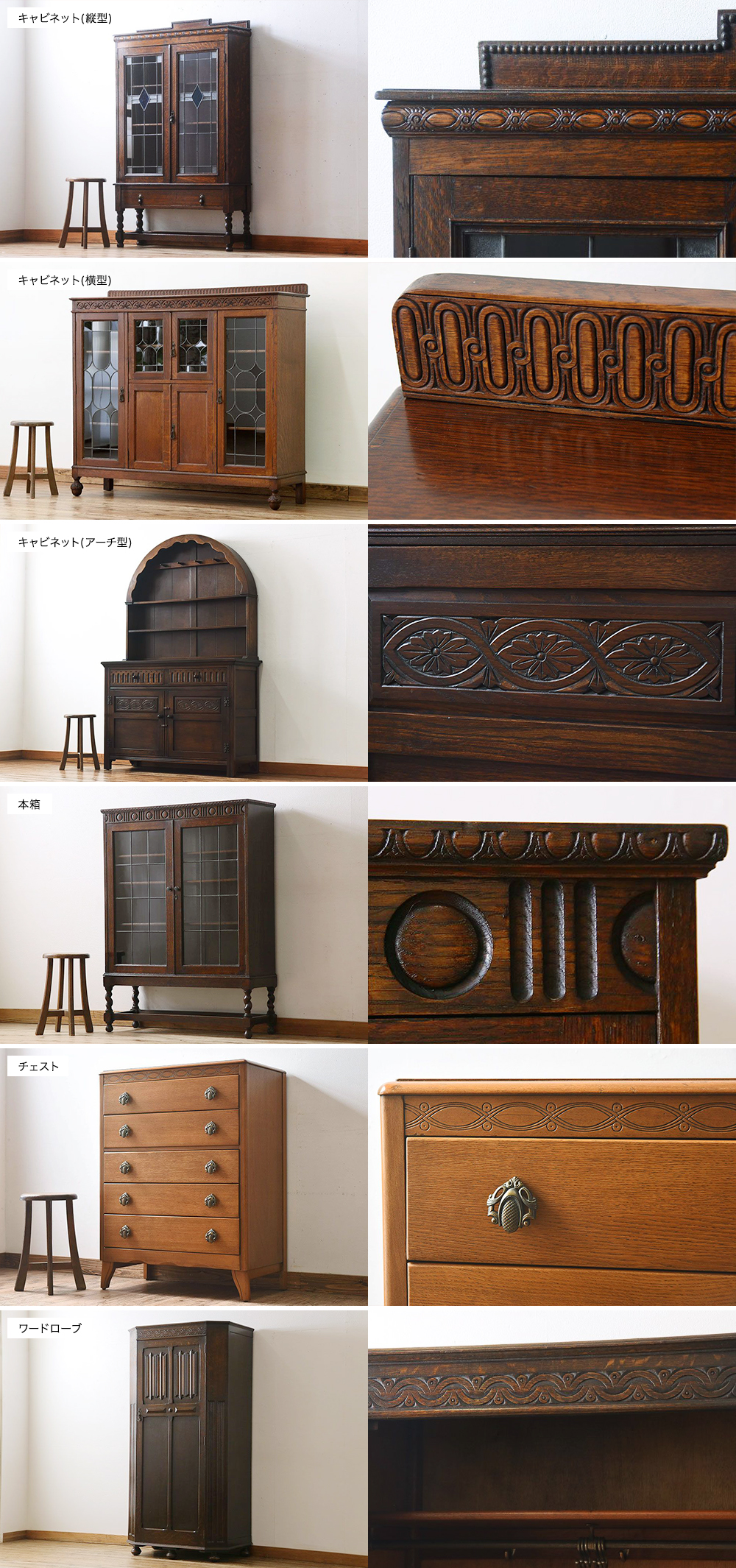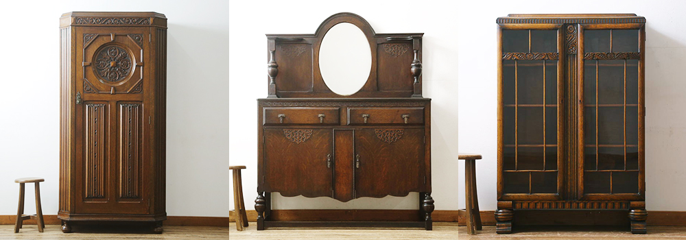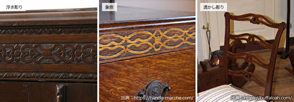 使われる素材によって技法も変わってきますが、家具においてのストラップワークは主に浮き彫りや象嵌、透かし彫りなどの技法を用いて作られます。中でもイギリスのアンティーク家具でよく見られるストラップワークは、さりげなく華やかさを演出したり、家具のアクセントになったりしながら、イギリスの伝統家具らしい重厚感と品格のある印象を与えています。そして美しく精巧に彫られたストラップワークからは、当時の家具職人の高い技術力を見て取ることができます。