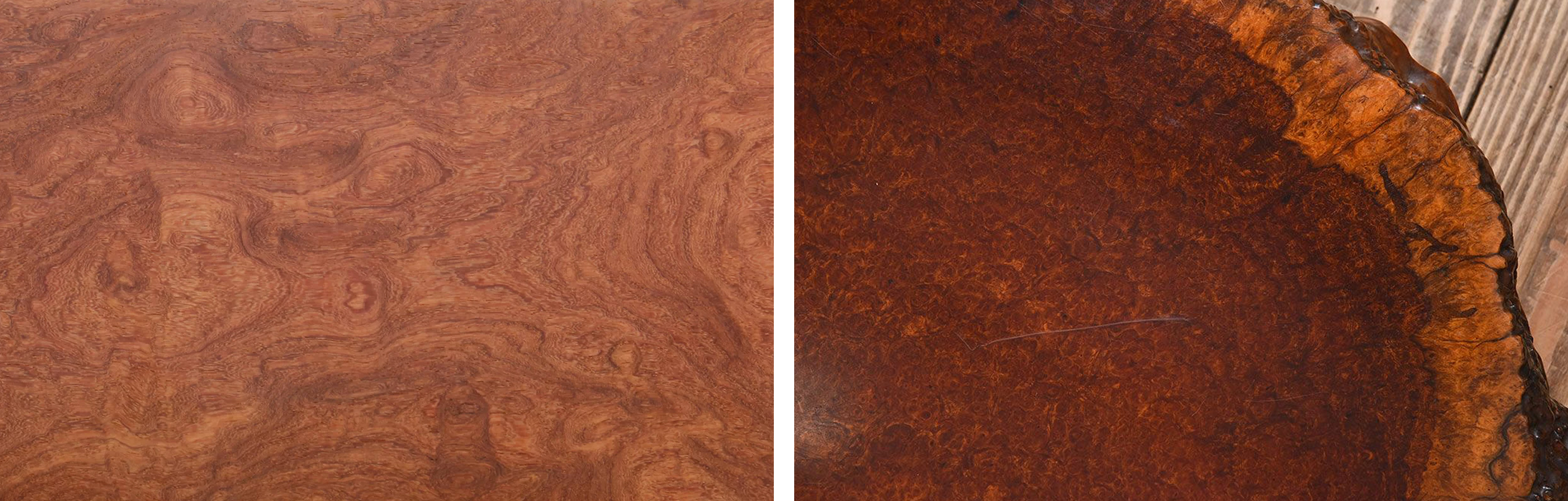 波状または交錯が見受けられる複雑な木理の中で花梨玉杢は美しい円を描いており、磨くと見事な光沢が出るという特性も相まって、高級材としての風格を表します。