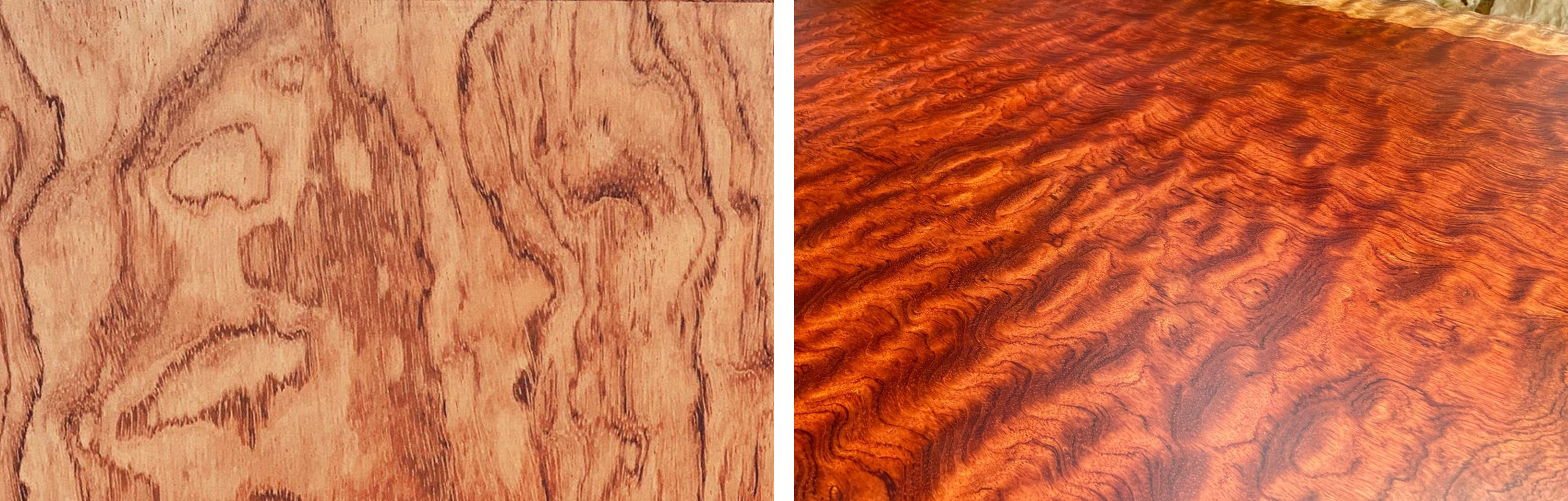 四季のない熱帯地域で育つため年輪は不明瞭ですが、ブビンガ玉杢は華やかに美しく浮かび上がります。