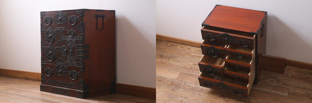 手許箪笥(てもとたんす)とは、貴重品や身の回りの小物などを収納する小ぶりな箪笥のことです。その名の通り、リビングなどのすぐ手が届くところに置いておき、便利に使えるのが特徴です。