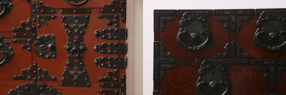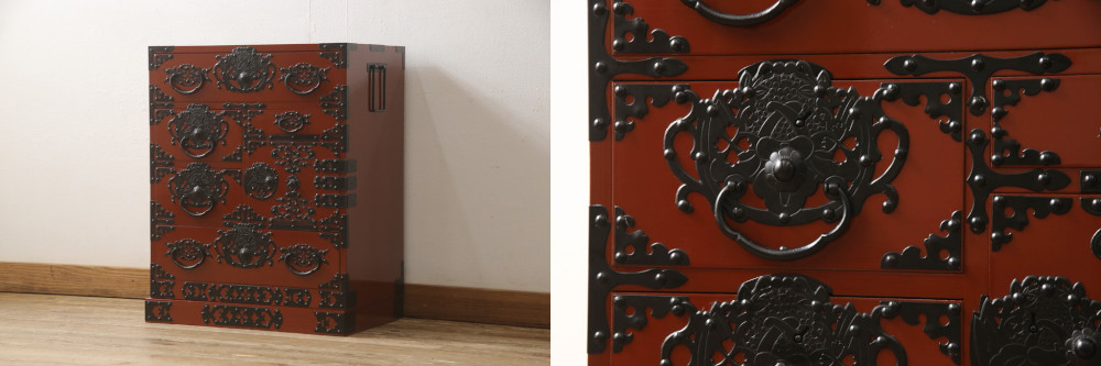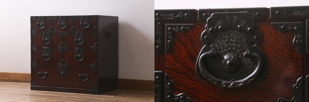 手許箪笥は大切なものを身近にしまっておく、という用途のため華やかな装飾のものが多く見られます。サイズは小ぶりであるものの、豪華なデザインで存在感がある箪笥です。漆塗りで仕上げられていたり、飾り金具を多く取り付けたり、なかには全体に蒔絵を施したきらびやかなデザインのものもあります。