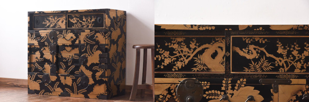 どこから見ても艶やかという言葉が相応しい手許箪笥です。全体にちりばめられた桐の蒔絵がきらびやかな美しさです。引き戸には梅の蒔絵を施し、ワンポイントのデザインとなっています。