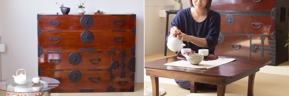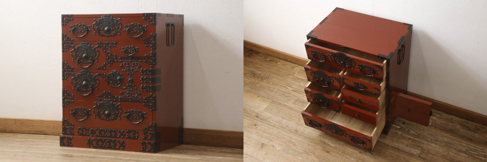 アンティークの米沢箪笥は、丸い錠前金具以外の装飾はシンプルなものが多いことが特徴的です。どちらかというと素朴な風合いがあり、落ち着いた雰囲気が魅力です。一方、ヴィンテージ品は、車箪笥や手許箪笥など米沢箪笥の原点に返ったアイテムが多いのが印象に残ります。もちろん衣装箪笥もありますが、アンティーク品と比較すると金物づかいが豪華になっています。時代の流れに合わせてデザインも進化してきたのが米沢箪笥なのです。