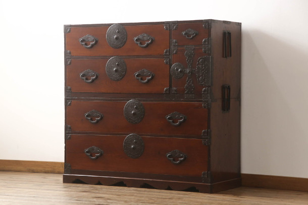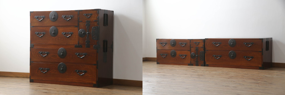 米沢箪笥の中でも最も数が多いのが衣装箪笥です。上下の二つ以上に分かれる重ね箪笥が豊富で、重ねても並べても使える便利さが魅力。シンプルなつくりに丸い錠前金具が映えるデザインです。