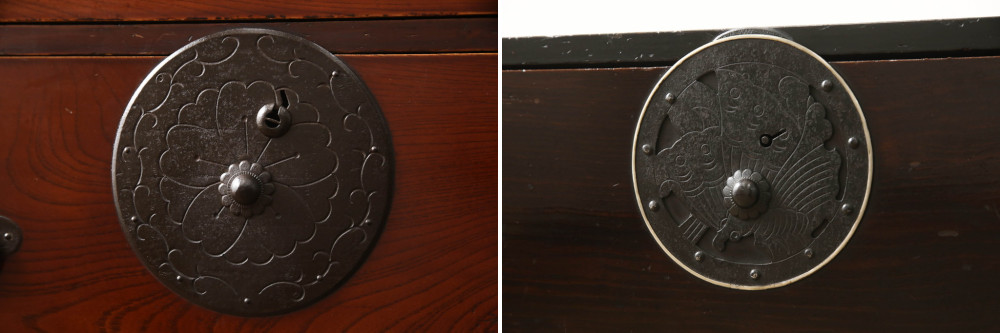 米沢箪笥の多くは欅や栗、杉、桐で作られており、漆塗りで仕上げられています。内部は桐で作られたものが多く、衣装箪笥としての機能を果たしていました。また、印象的なのが錠前金具として使われる大きな丸い金物遣いです。この金物には蝶や桜といった文様が彫られており、箪笥全体だけでなく金物の彫刻にも注目したい箪笥です。