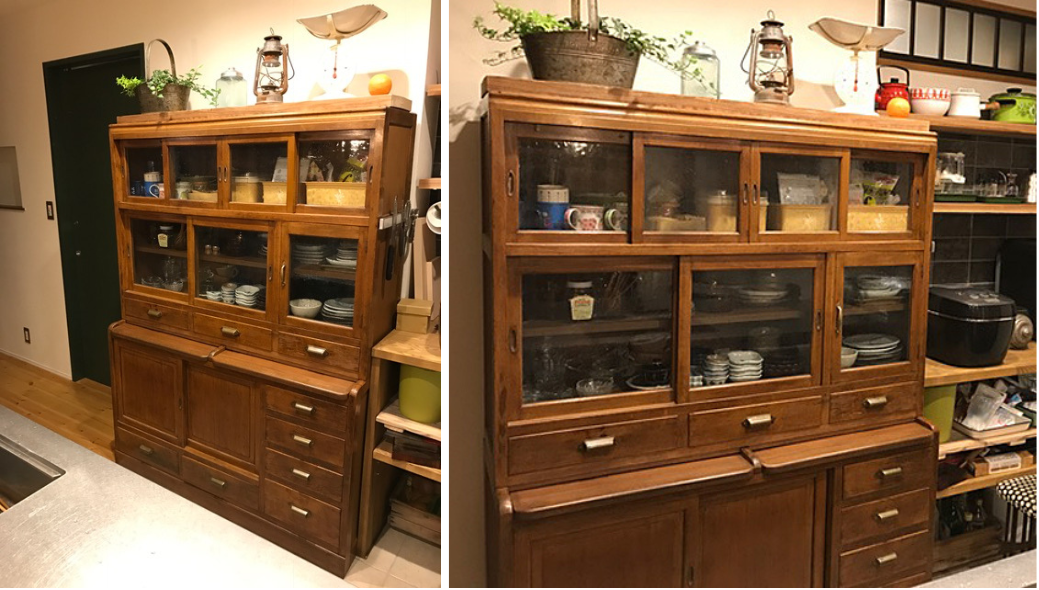 【お客様のレビュー】レトロな毎日様 和製アンティーク 食器棚ご購入「食器棚のガラスが最高です」