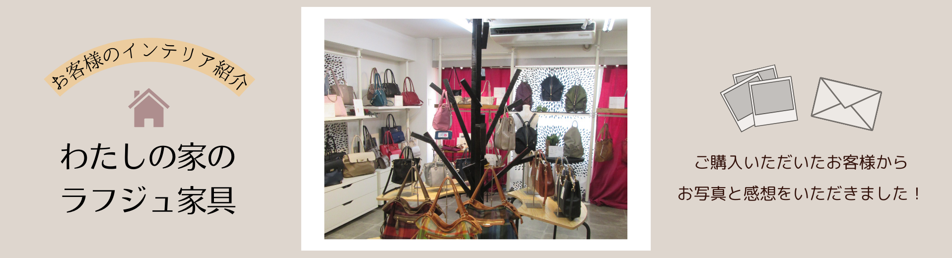 テーブルのシンプルなデザインが展示品の魅力を引き立て、中央にあるポールハンガーが絶妙に全体のバランスをとっていてとても目を惹きますね!こちらのポールは手作りとのことで、SAC様のディスプレイスペースに掛ける思いが伝わってきて感動いたしました。