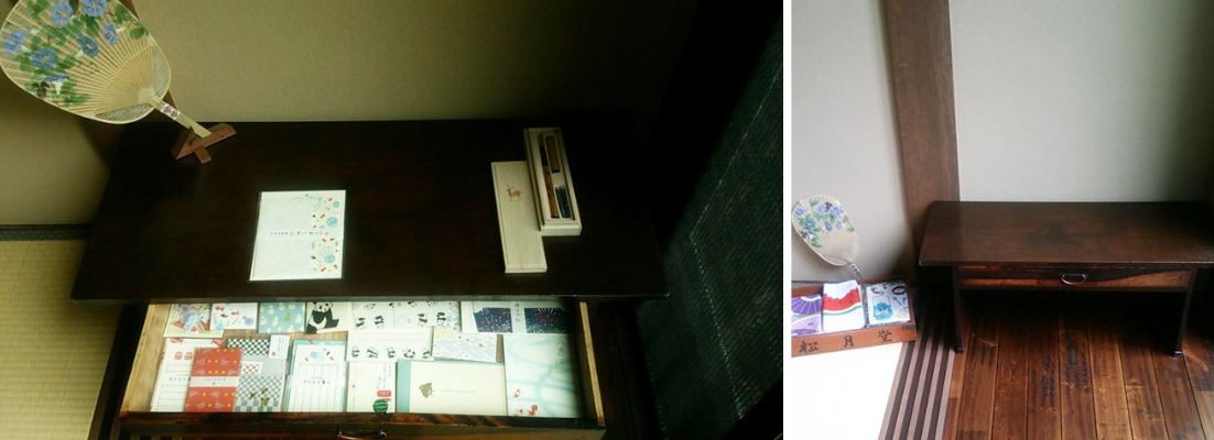 一杯だけ付いた引き出しが、とても愛らしい文机ですよね。