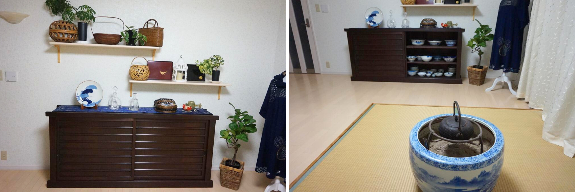 リビングに置いているので、和洋折衷になるようにガラスのデキャンタなども飾りました。