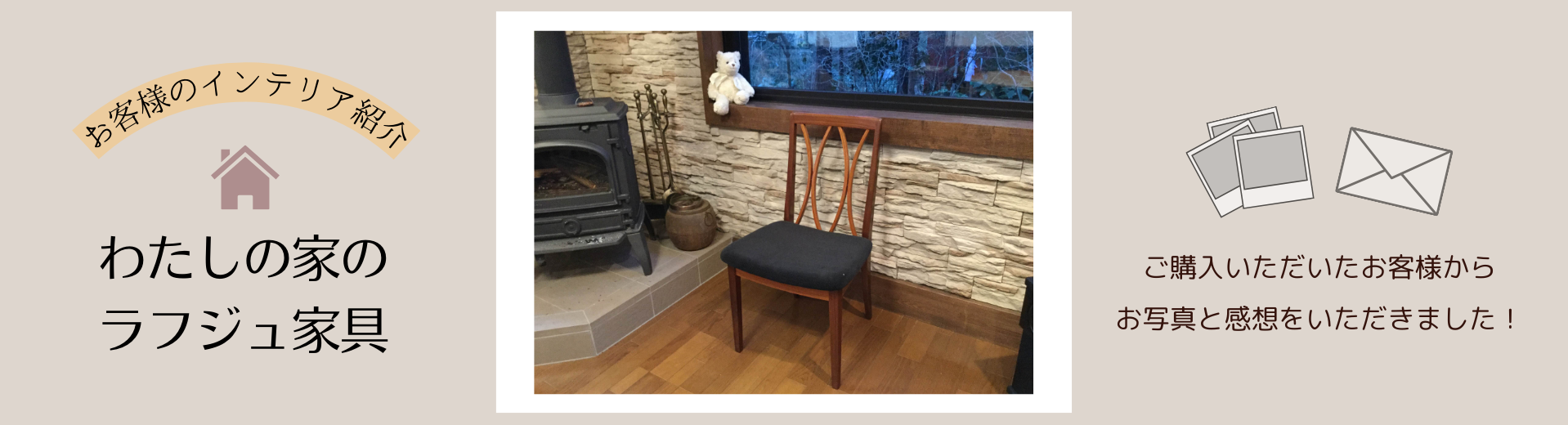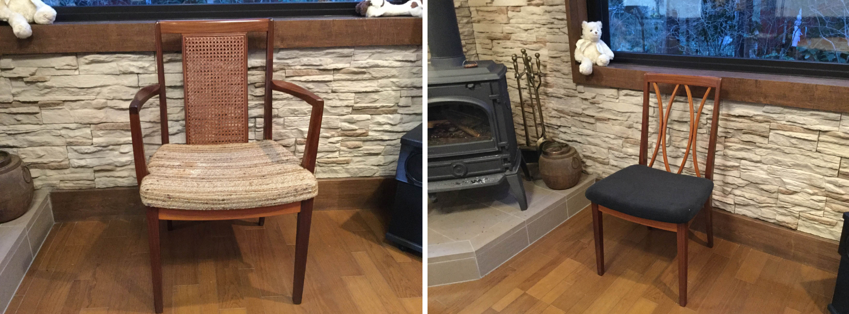 薪ストーブがある空間に、温かみのあるチーク材のチェアはよく似合いますね。