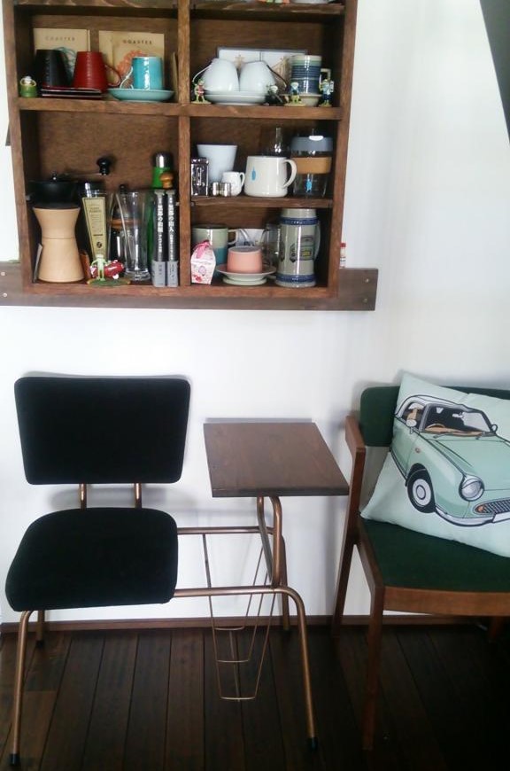 今まで見たことのない形の椅子に一目惚れ。コーヒーtable&本立てがついている。