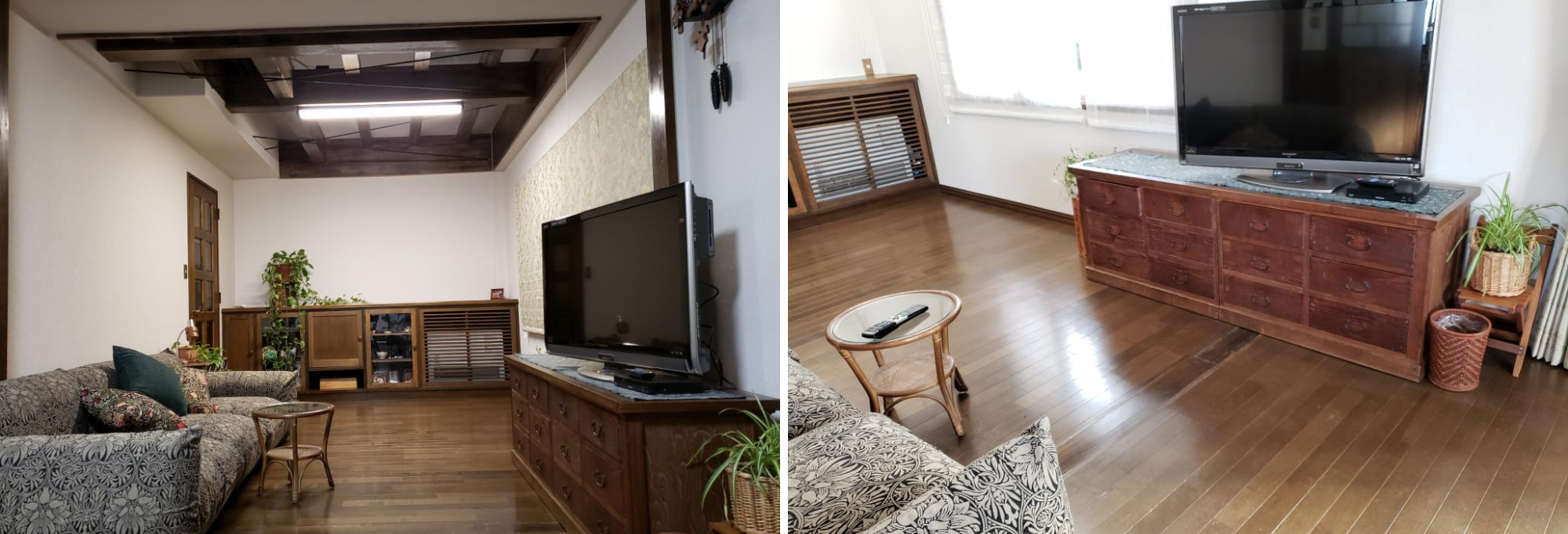 実際に倉庫を見学させていただき、求めるイメージにぴったりのテレビ台を見つけることができました。部屋のイメージをまとめてくれる家具です。テレビを載せるため天板を新しい木材で補強していただきましたが、ほかの部分と馴染んでいます。(写真では古布を敷いてありますが)