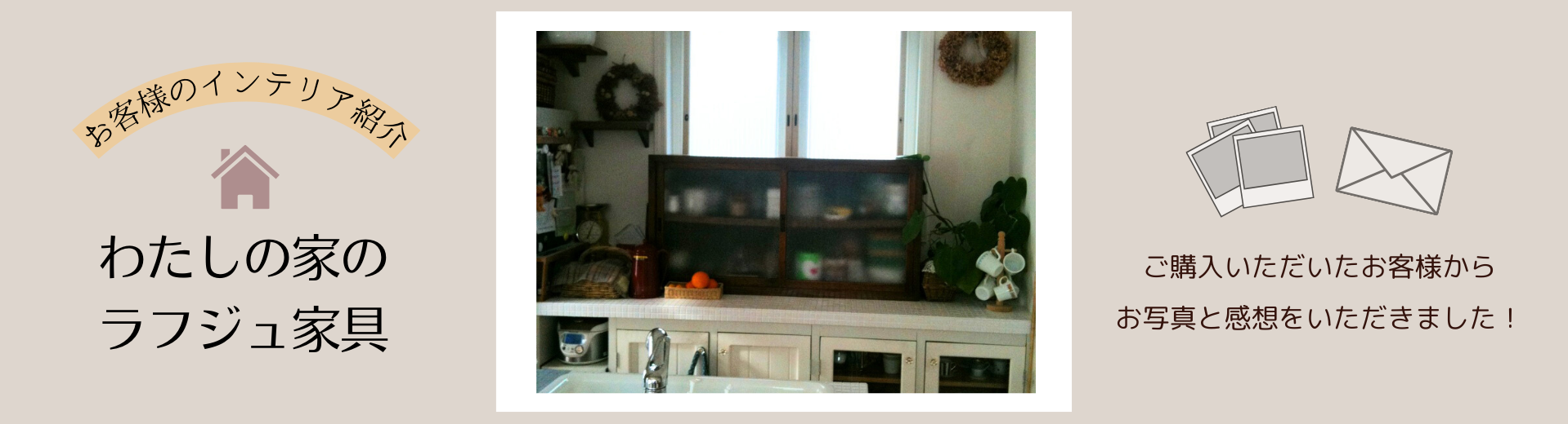 キッチンにラフジュさんで購入したダイヤガラスの収納棚と銀モールガラス窓を置きました。収納棚はガラスケースとどちらがいいのかかなり悩みましたがこの収納棚にして本当に良かったです。とっても収まりがよく使い勝手もよさそうで大満足しています。配送希望を無理を言って聞いていただき感謝いたします。気持ちよく買い物をさせていただきました。ありがとうございました。