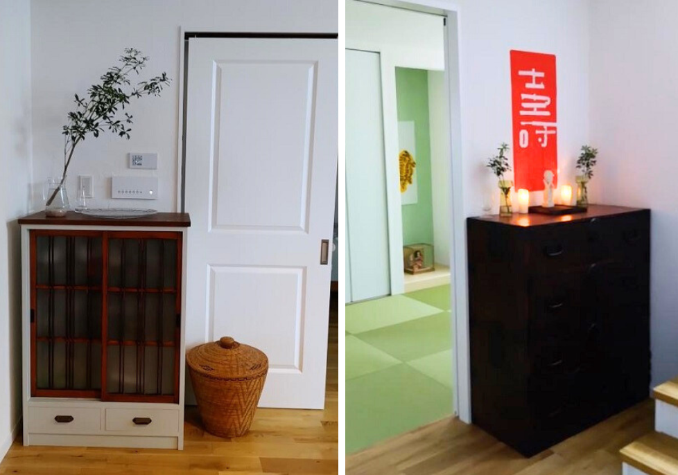 落ち着きのある和箪笥は、フローリングと和テイストのお部屋を繋ぐ架け橋のような存在で、見事に空間に溶け込みながら素敵な味を醸し出していますね!