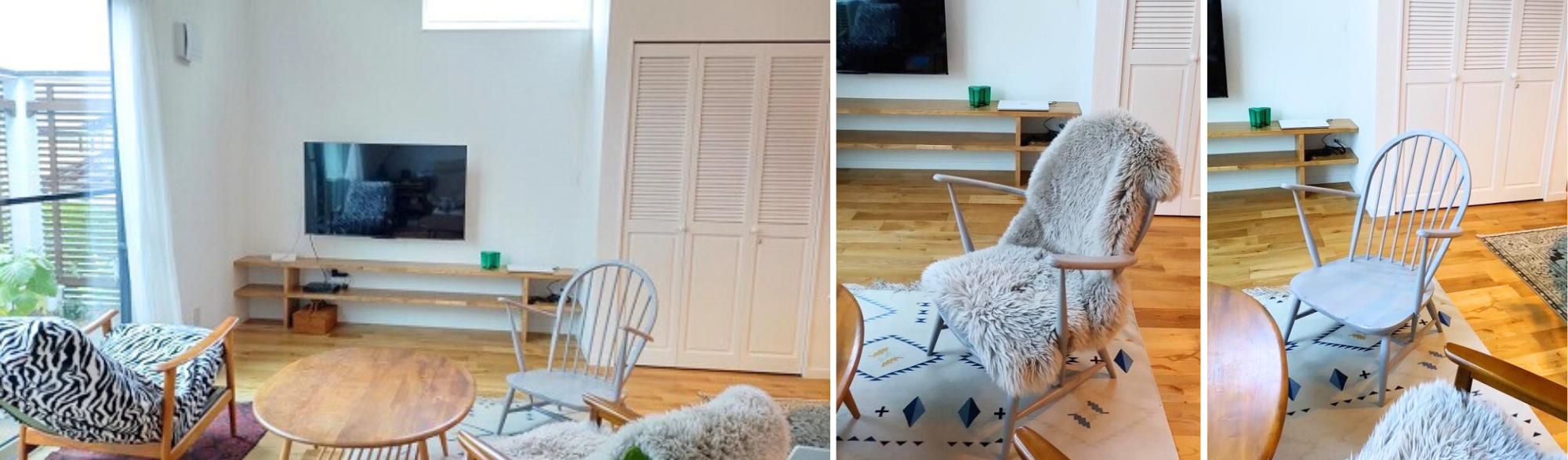 お手持ちのチェアに仲間入りしたERCOLのチェアは、以前からそこにあったように馴染んでおり、ムートンカバーによって違った表情も楽しめてとても魅力的ですね♪