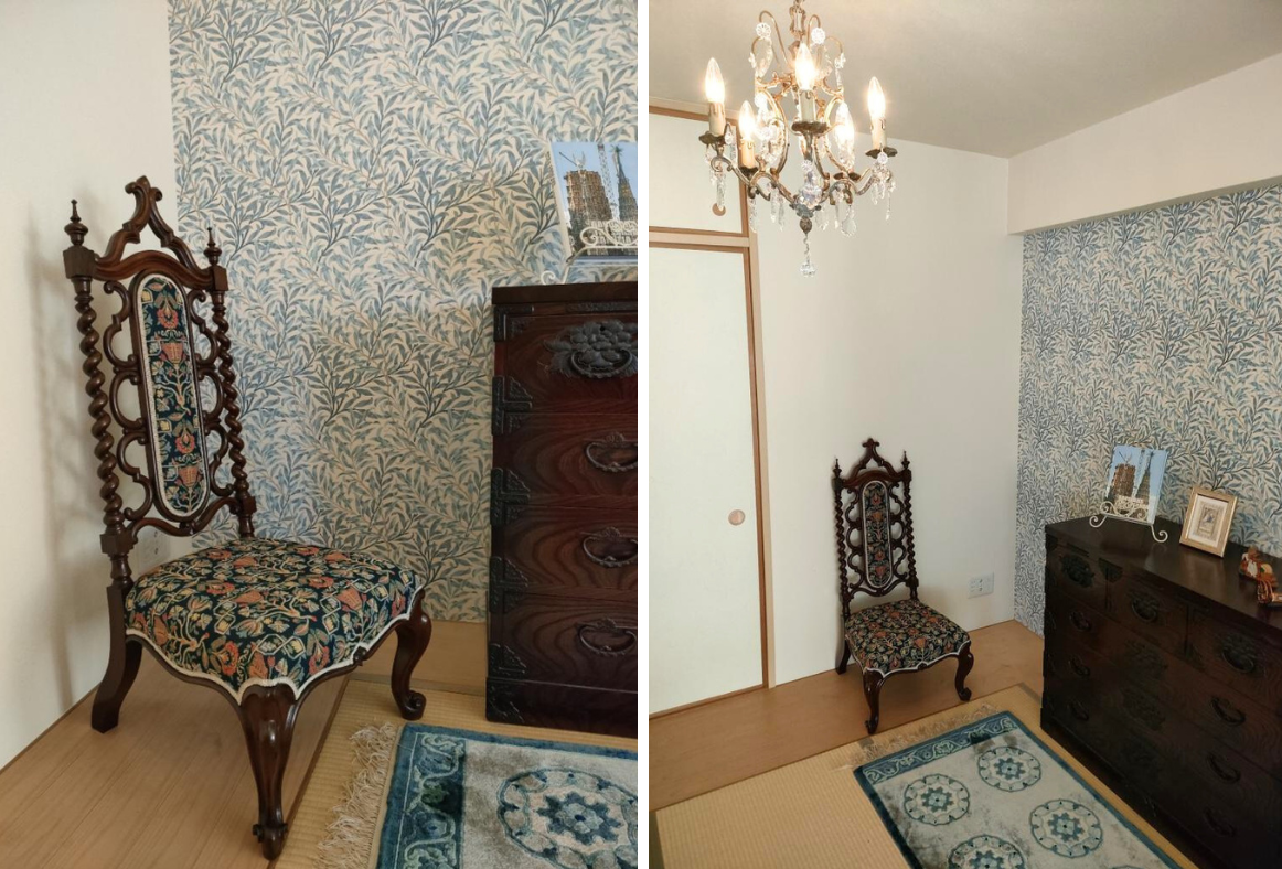 畳、シャンデリア、ボタニカル柄の壁、和箪笥など「和と洋」が絶妙に調和する大変オシャレなお部屋に、チェアの色味や生地の柄、優雅な雰囲気などがよく馴染んでいます!