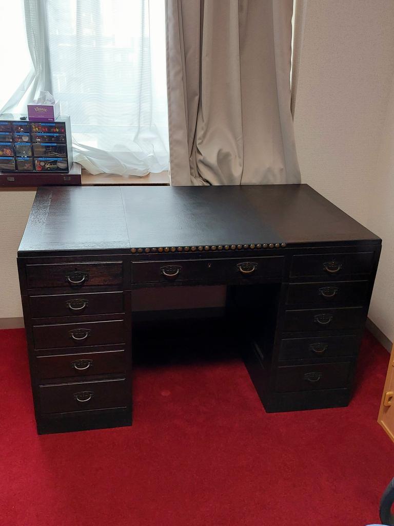 約100年前にご使用していたデスクとあって、長い年月の中で刻まれた味わいと貫禄をひしひしと感じ、引手金具や鋲の凝ったデザインからは職人さんの細やかなこだわりが伝わり、とても魅力にあふれた貴重な一品ですよね!