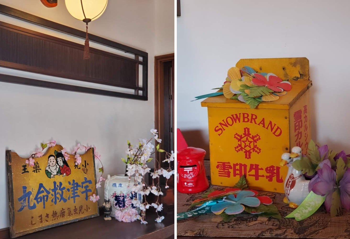 「宇津救命丸」の看板からはレトロ感が漂い、その懐かしさの詰まった佇まいがたまらなく素敵ですよね!ただ置くだけでも絵になるデザインですが、月桂冠の花瓶やのらくろくんなどと組み合わせるとより一層風情を感じます♪