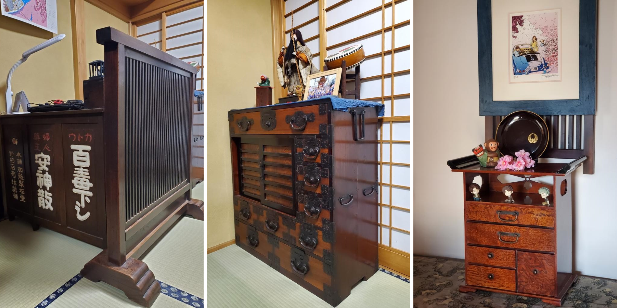 松本帳場箪笥は、職人技が光る重厚な金具がびっしりと並び堂々たる存在感が感じられます。様々なサイズの引き出しと戸棚があり収納力抜群なので、かじおと様のおっしゃる通りお子様の物の整理整頓にピッタリですね!和の小物がずらりと並ぶディスプレイも大変素敵です♪