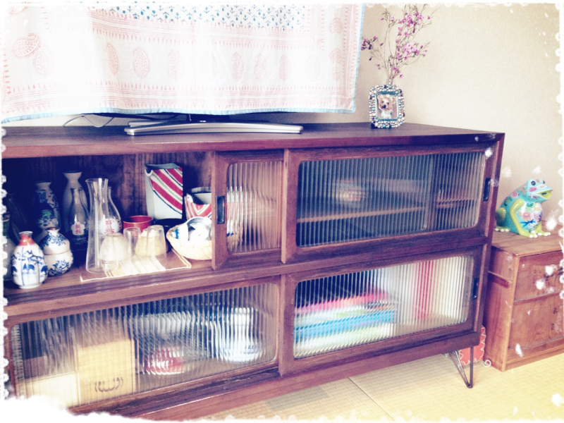 太陽の光を浴びたモールガラスがキラキラと収納だけじゃないアンティーク家具ならではのあたたかみあるインテリア空間ですね。