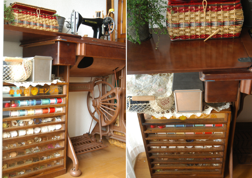 2年前に購入しました糸ケースです。 手作りが大好きで、たくさん集めたリボンやボタンの収納に大変役立っています。 母から譲り受けた現役の足踏みミシンの下に、ぴったり収まりました。 ここは私のお気に入りの場所、ほっこり落ち着く昭和の空間です。