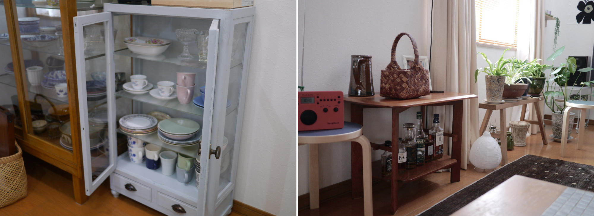 ガラス棚とサイドテーブル、古い物をちょっとずつ取り入れています。